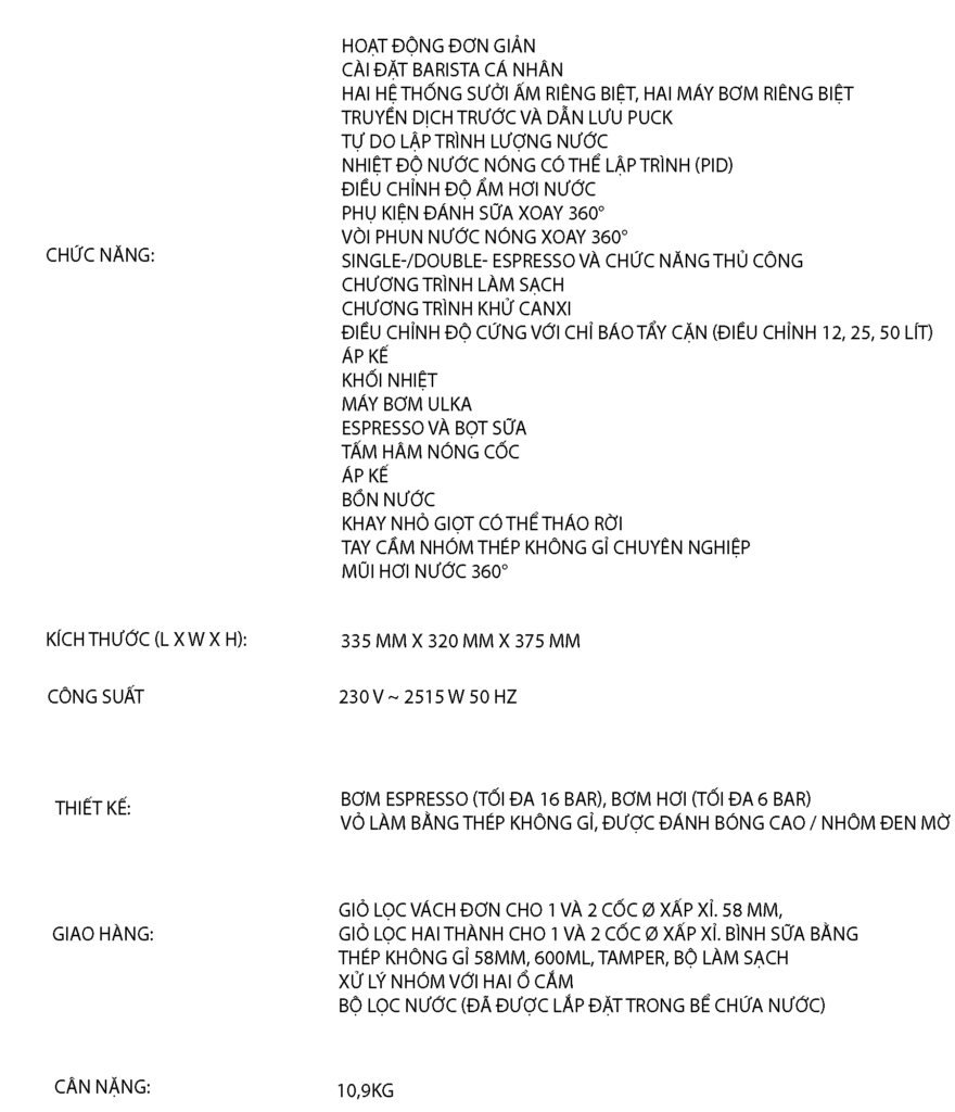 Với sự trợ giúp của bảng điều khiển, cả nhiệt độ nước (điều khiển PID) để pha cà phê espresso và độ ẩm hơi nước đều có thể được điều chỉnh. Ngoài ra, thể tích cốc có thể được đặt cho một hoặc hai tách cà phê espresso.