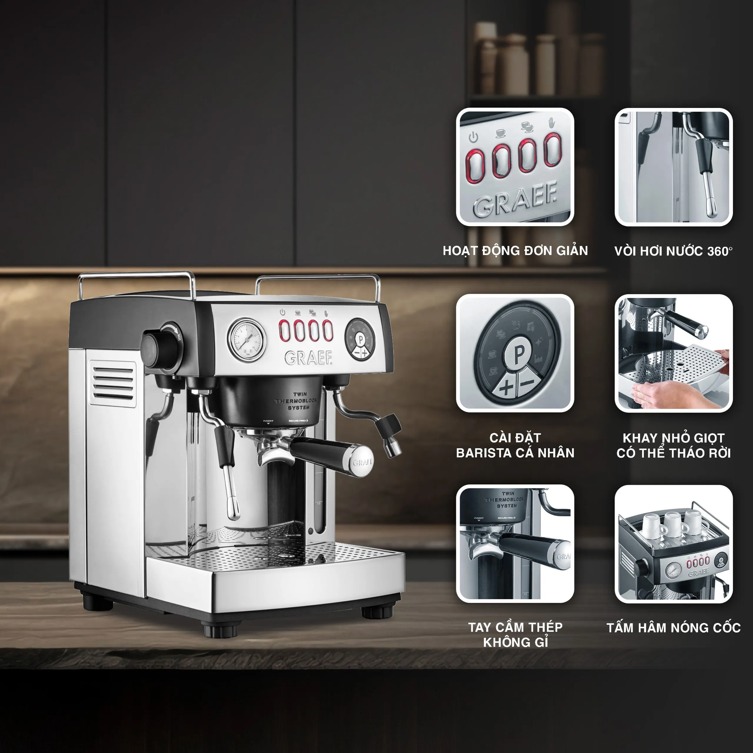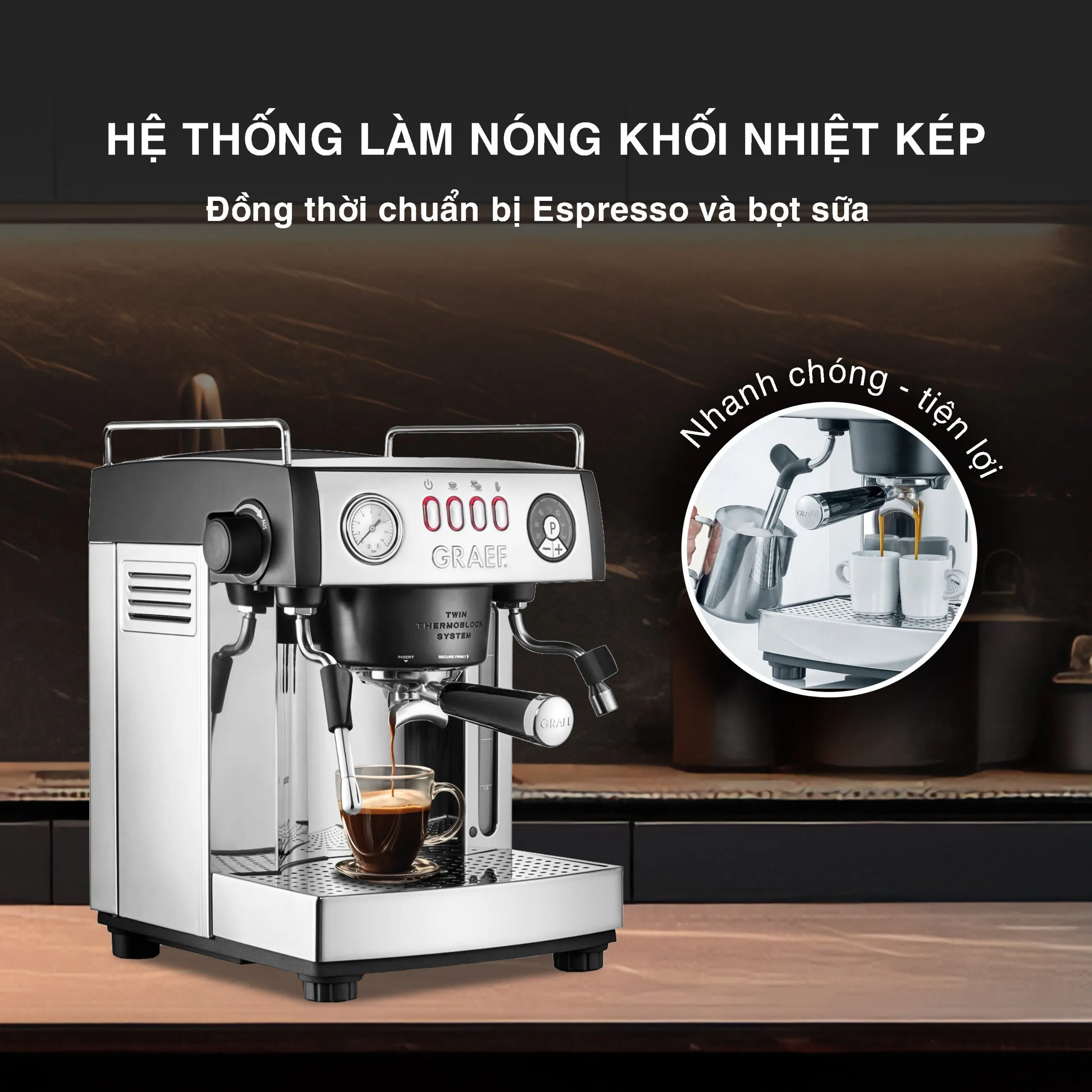 Máy pha cà phê espresso GRAEF “baronessa” giờ đây giúp pha cà phê cappuccino hoàn hảo nhanh hơn. Nhờ hệ thống bơm kép với hai mạch gia nhiệt riêng biệt, mẫu máy này có thể pha cà phê espresso và bọt sữa đồng thời mà không cần thời gian gia nhiệt lâu.