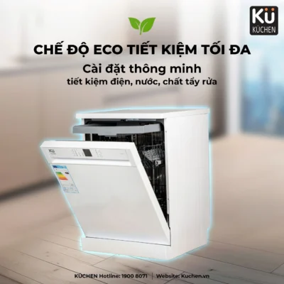 - Mức tiêu thụ nước: 9L/ chu trình rửa siêu sạch, tiết kiệm hơn rất nhiều so với rửa bằng tay