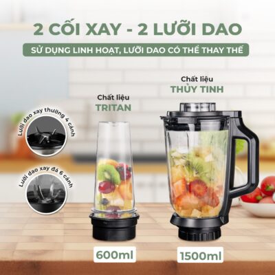 – Cối ly được thiết kế nguyên liệu thủy tinh bền chắc. Cốc tiện lợi được làm từ chất liệu Tritan đảm bảo an toàn