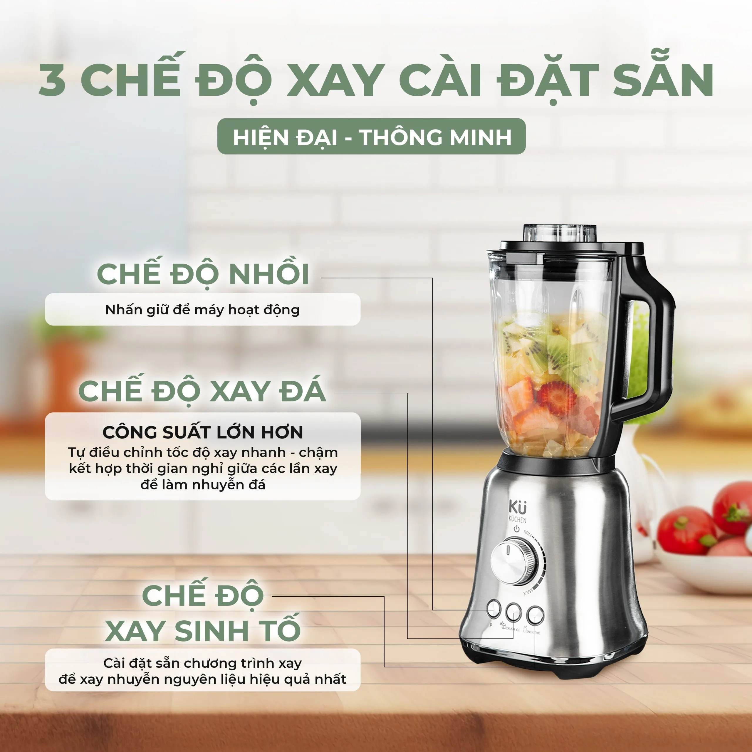 Để có thể trở thành chiếc máy xay đắc lực nhất, Kuchen đã nỗ lực nghiên cứu và phát triển các chương trình xay trộn sẵn phù hợp với những nhu cầu sử dụng khác nhau, những công thức khác nhau. Mỗi nguyên liệu đều được xem xét tỉ mỉ vì đặc tính của chúng khác nhau, có nguyên liệu thì cứng, có nguyên liệu thì mềm, có nguyên liệu ở dạng sợi. Mỗi loại công thức cũng cần thời gian xay, tốc độ xay khác nhau. Và máy xay sinh tố KU BB2012 là kết tinh của thế giới chuyên nghiệp ấy. Tất cả những gì bạn cần làm là bỏ nguyên liệu vào cối xay, sau đó chọn một chương trình xay phù hợp và đợi máy xay KU BB2012 hoàn thành phần việc còn lại.
